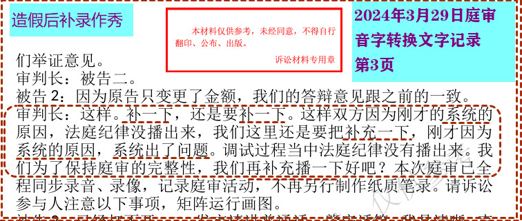 审判长:这样。补录一下 ,还要补录一下。这样双方因为刚才的系统的原因,法庭纪律没播出来,我们这里还是要把补充一下,刚才因为系统的原因,系统出了问题……