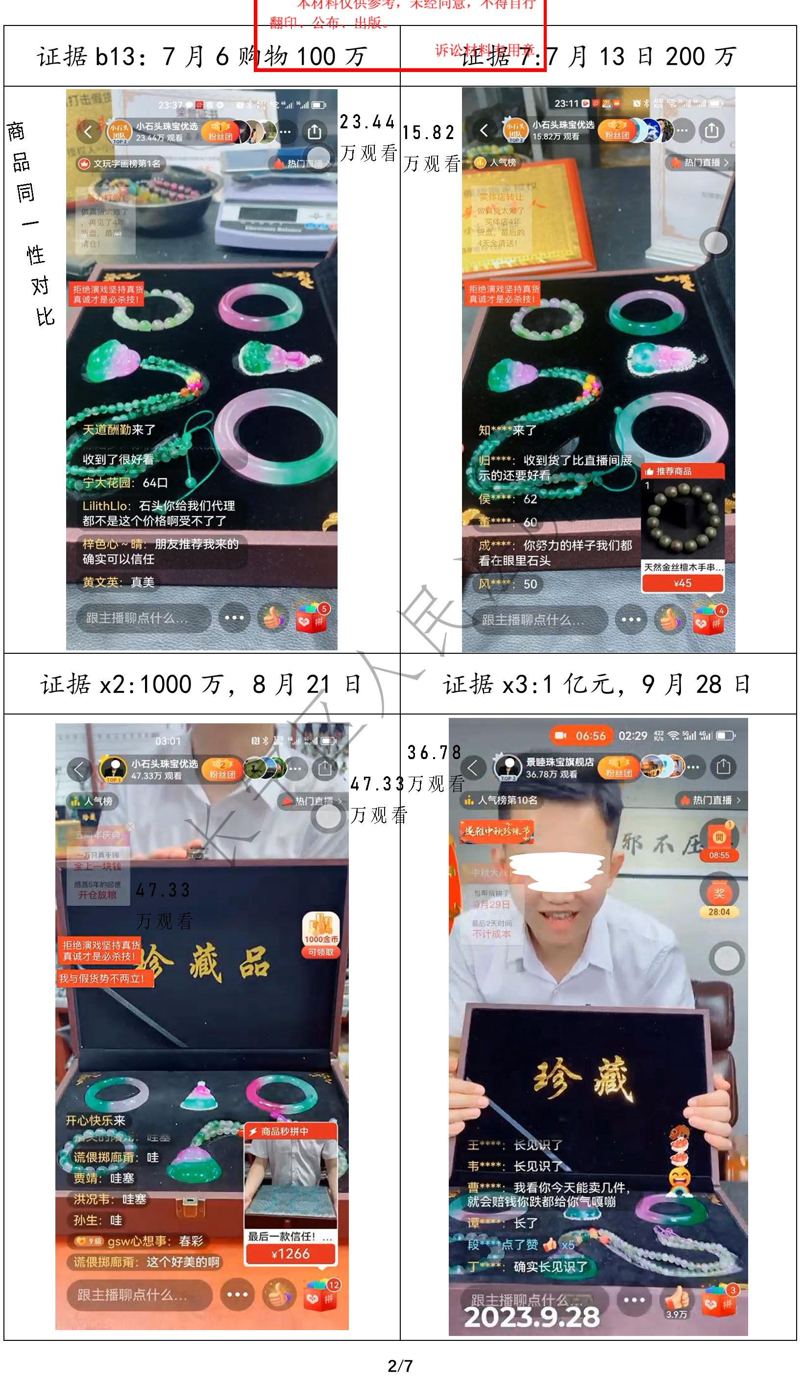 ⑤ 原告损失与商家获利情况 (i)原告本应享有这个标的物具有的利益,但实际没有得到,被告应补偿该利益损失扩大部分。相对7月6日扩大的利益损失900万元,是被告2拼多多不作为没有对被告1采取必要措施造成的,原告没有过错。 (ii)这个900万损失被告1是能够预见到的,因为该翡翠套装市场价格是他定的,他是商人,知道价格变化的利益得失。 (iii)直播间宣传展示的标的物是真货(因为直播间经常现场检测↑14. (9)图),现在真货标的物还在商家手中,没有转移给原告,商家因标的物商品升值自然获利会增加,商家获得的利益就是原告的损失(把标的物翡翠当成房子就好理解了)。 (iv)本案这里,原告选择8月21日1000万报价索赔。 暂时放弃被告1亿元报价,虽然1亿元报价也是法律事实,且另有旁证证明其价格具有合理性。《判决书》第5页,“2023年保利春季拍卖会翡翠手镯拍出6000万视频、……中国最贵十大玉石手镯材料、……百姓购买翡翠手镯参考价”。