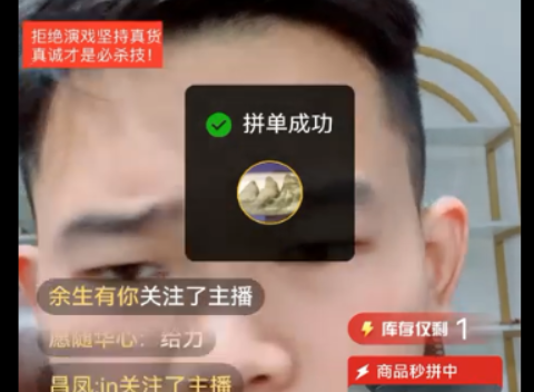 “断片” 后段录屏(2329-32分)【证据b12】开头显示“拼单成功”图标,说明断片中被告说完“假一赔三”后,原告有订单“拼单成功”。